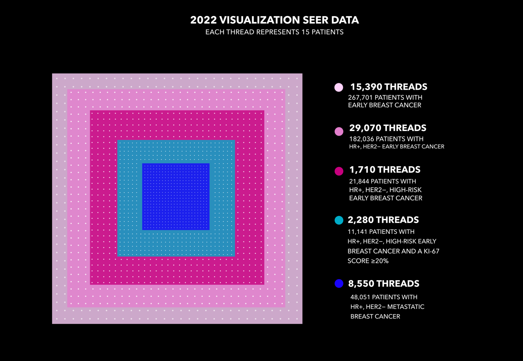 We created a mesmerizing data visualization of breast cancer incidents rates in the US in 2022. In the outer rings, we used 3 different hues of pink to recognize women living with early breast cancer (EBC), HR+ HER2- EBC, and high-risk HR+ HER2- EBC.
